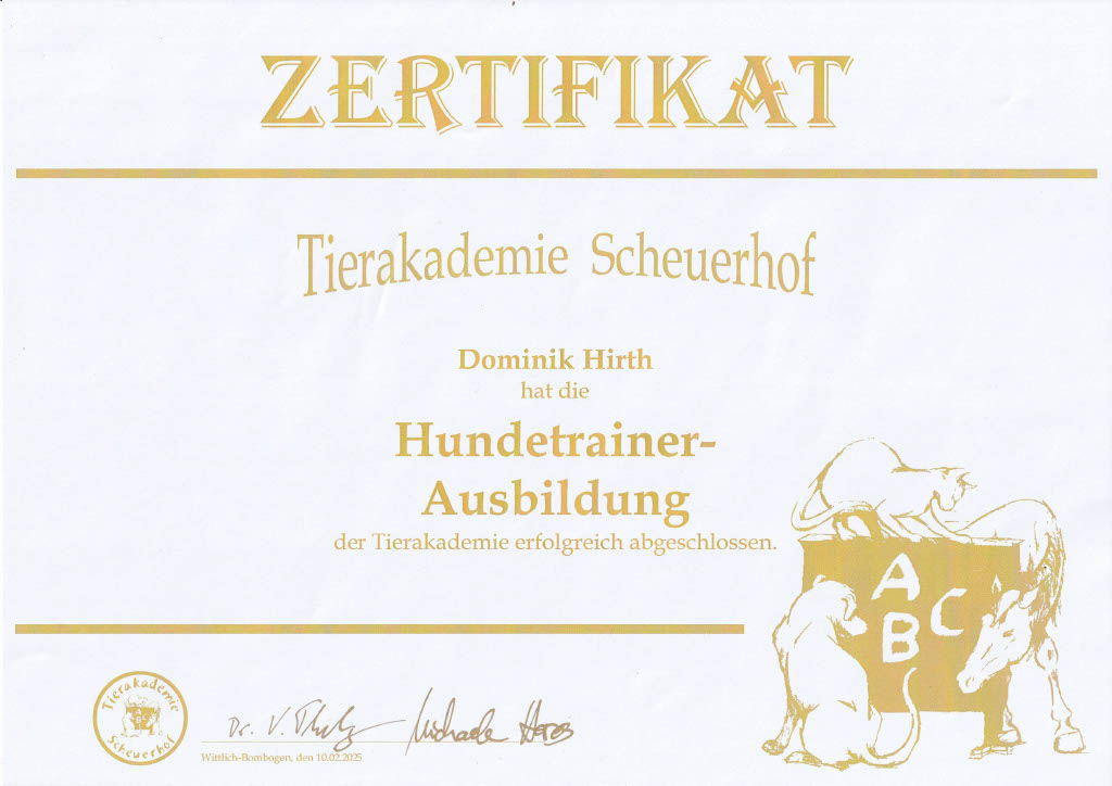 Um mein Wissen zu vertiefen und professionell weiterzugeben, habe ich die Ausbildung zum Hundetrainer bei der Tierakademie Scheuerhof unter der Leitung von Viviane Theby und Michaela Hares erfolgreich absolviert.